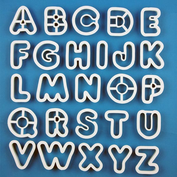 Σετ κουπάντ 26 τεμαχίων από πλαστικό κατάλληλο για τρόφιμα με όλα τα γράμματα του λατινικού αλφαβήτου, σε πλάτος 5 cm.