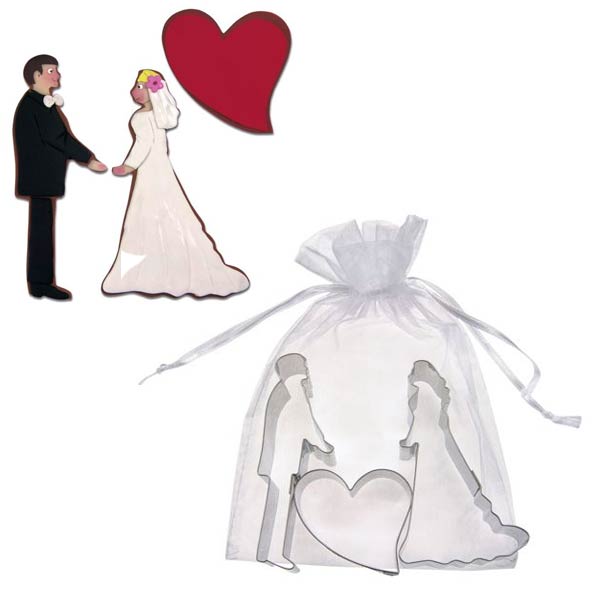 Ανοξείδωτο κουπάντ με θέμα το γάμο, και διαστάσεις 9,5 cm (γαμπρός) 9 cm (νύφη) και 5,5 cm (καρδιά).