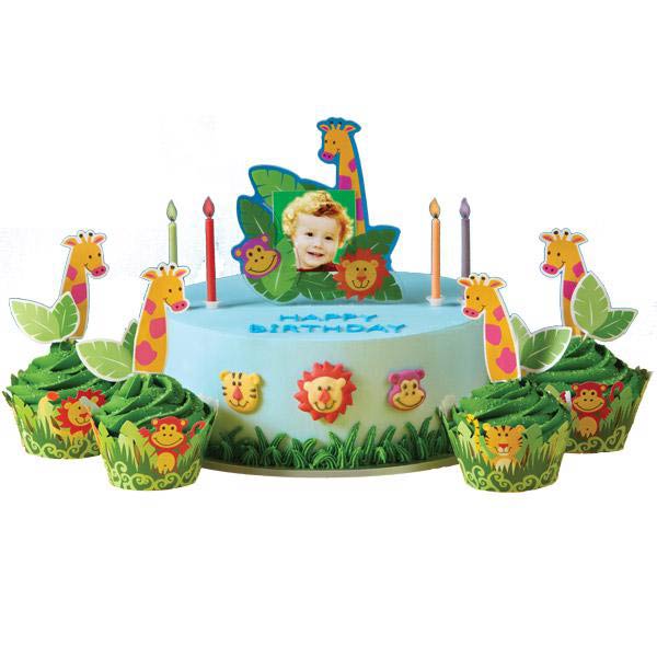 Πλαίσιο φωτογραφίας για τούρτα με θέμα την ζούγκλα και τα άγρια ζώα με λιοντάρι, μαϊμού και καμηλοπάρδαλη, σε διάσταση 11x13 cm.