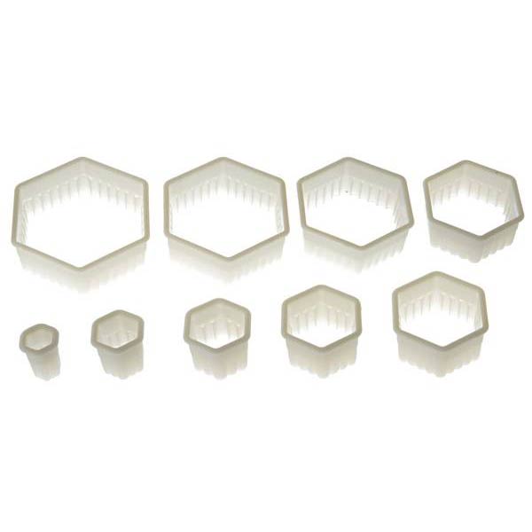 Σετ 9 τεμαχίων ανοξείδωτων κουπάντ  με σχέδιο εξάγωνα με δοντάκια, σε διαστάσεις από 30 μέχρι 120 mm.