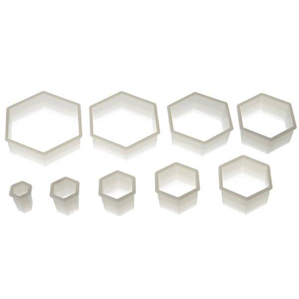 Σετ 9 τεμαχίων ανοξείδωτων κουπάντ με σχέδιο εξάγωνα με δοντάκια, σε διαστάσεις από 30 μέχρι 120 mm.
